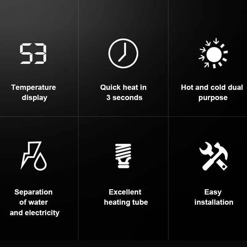 MEHRFACHE SICHERHEITSVORKEHRUNGEN: Ihre Sicherheit ist unsere oberste Priorität. Dieser Heißwasserhahn ist mit mehreren Sicherheitsvorkehrungen ausgestattet, die eine sorgenfreie Nutzung gewährleisten. Er ist so konzipiert, dass er Überhitzung, Trockenbrand und elektrische Lecks verhindert.