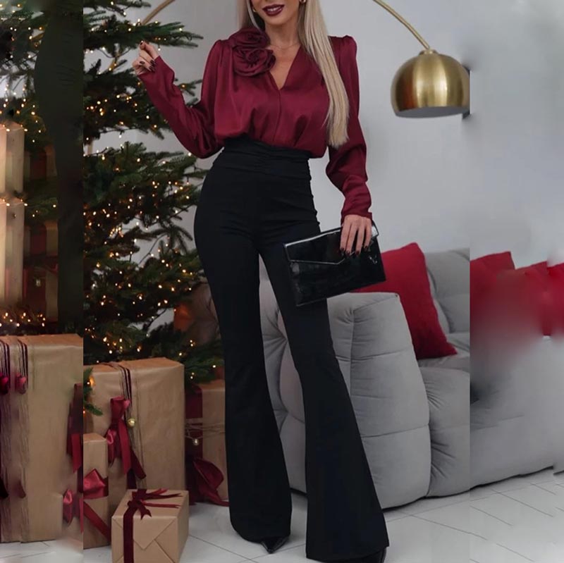 Paket beinhaltet: 1 * Luxuriöse Damen Satin V-Ausschnitt Bluse mit Rose Detail