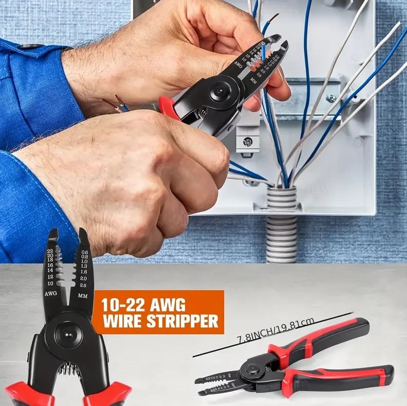 - Merkmale: Abisolierzange 10-22 AWG + Crimpzange 10-22 AWG + Begrenzungszange + Blechschere + 1 Diagonalzange