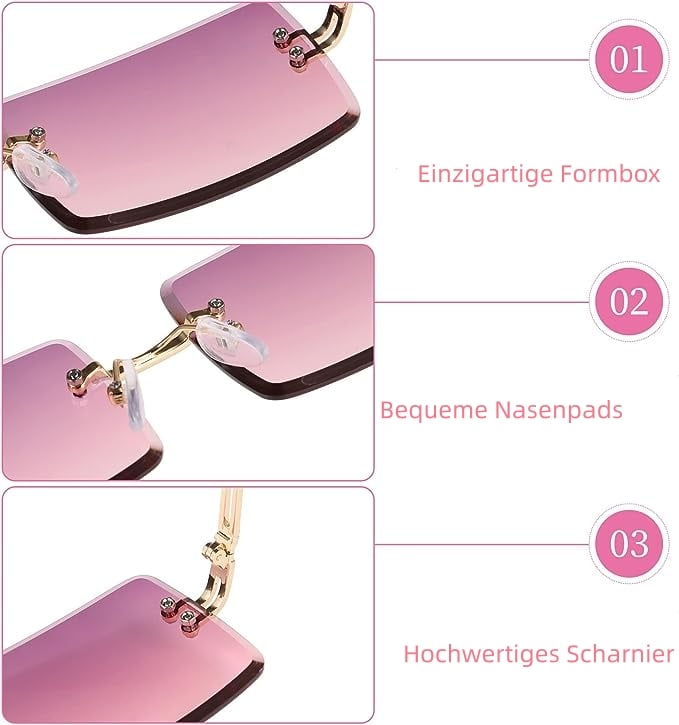 Verbessern Sie Ihren Stil mit unseren rechteckigen rahmenlosen Vintage-Sonnenbrillen mit klaren GlĂ€sern. Diese trendigen Sonnenbrillen bieten ein minimalistisches und doch schickes Design, das jedes Outfit ergĂ€nzt. Diese rahmenlosen Sonnenbrillen sind perfekt fĂŒr MĂ€nner und Frauen und verleihen Ihrem Look einen Hauch von Retro-Flair, wĂ€hrend sie Ihre Augen vor schĂ€dlichen UV-Strahlen schĂŒtzen.