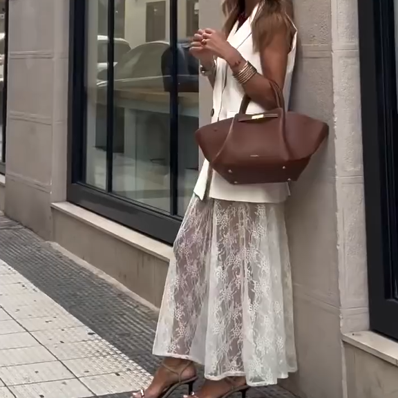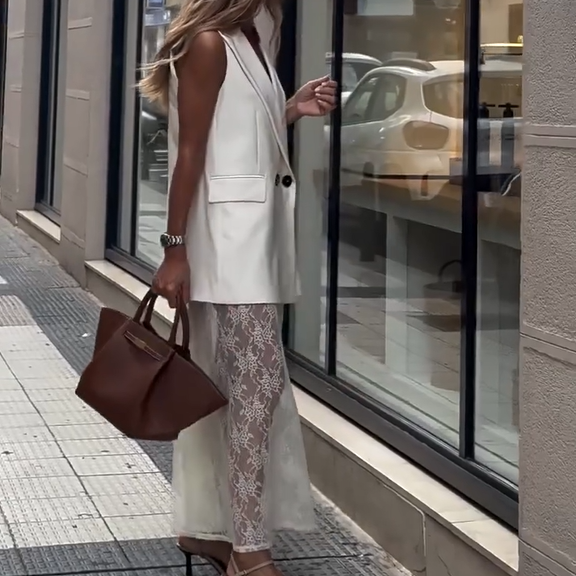 ZEITLOSES UND ELEGANTES AUSSEHEN: Die Kombination aus ärmelloser Blazerweste und Spitzenrock bietet ein klassisches und doch modernes Design, das sowohl für legere als auch für formelle Anlässe einen mühelos stilvollen und raffinierten Auftritt ermöglicht.
