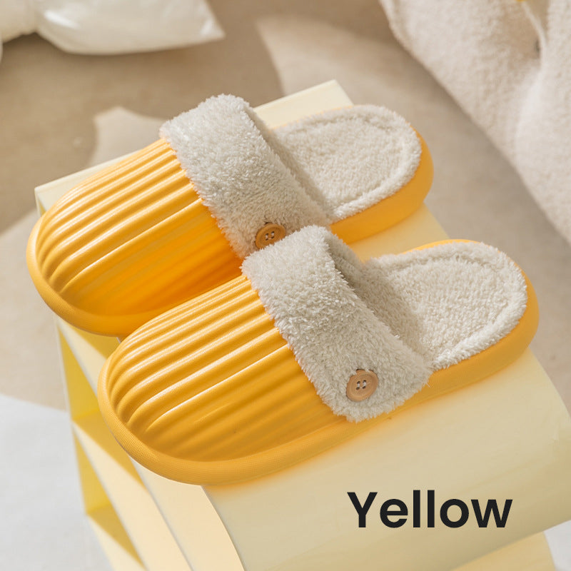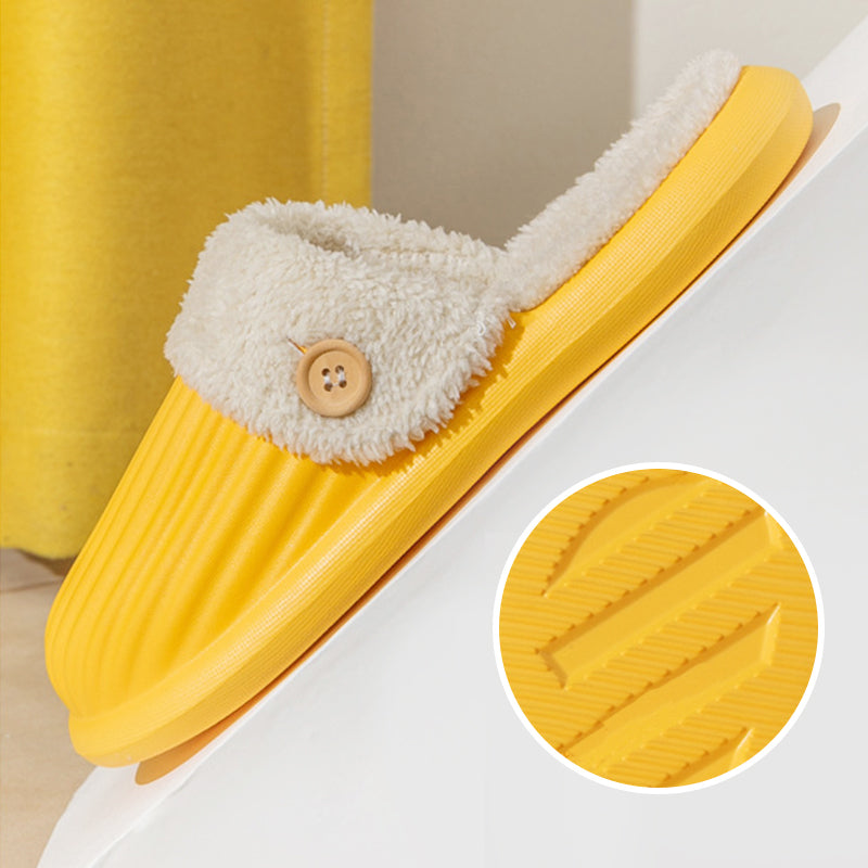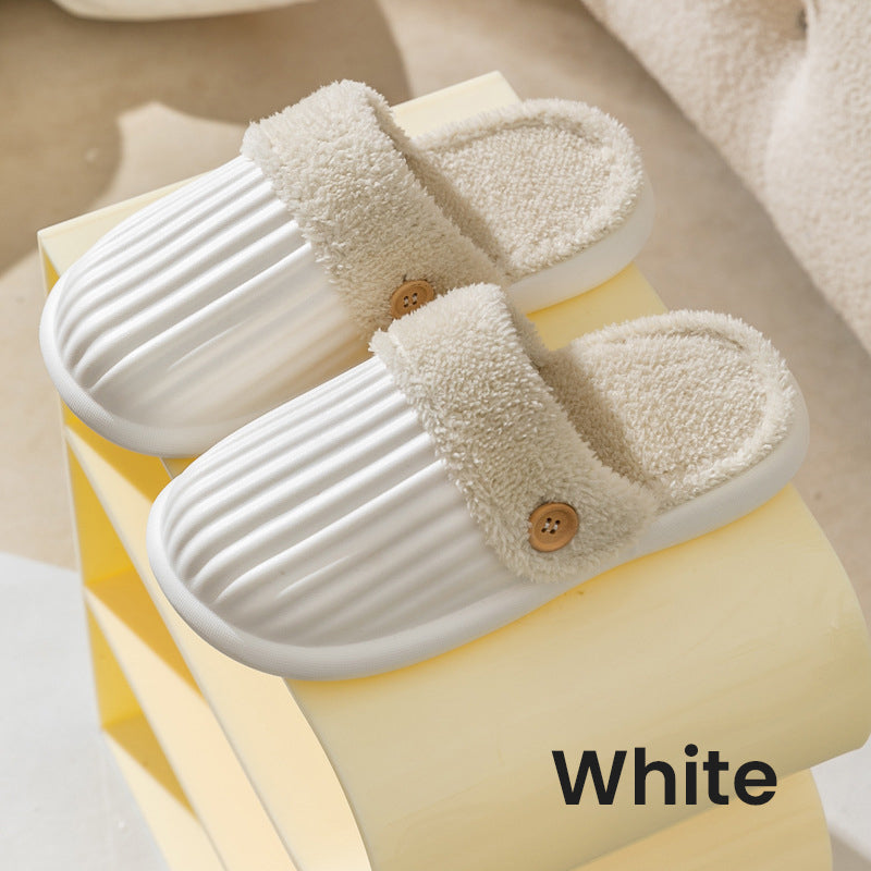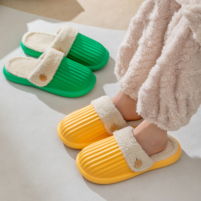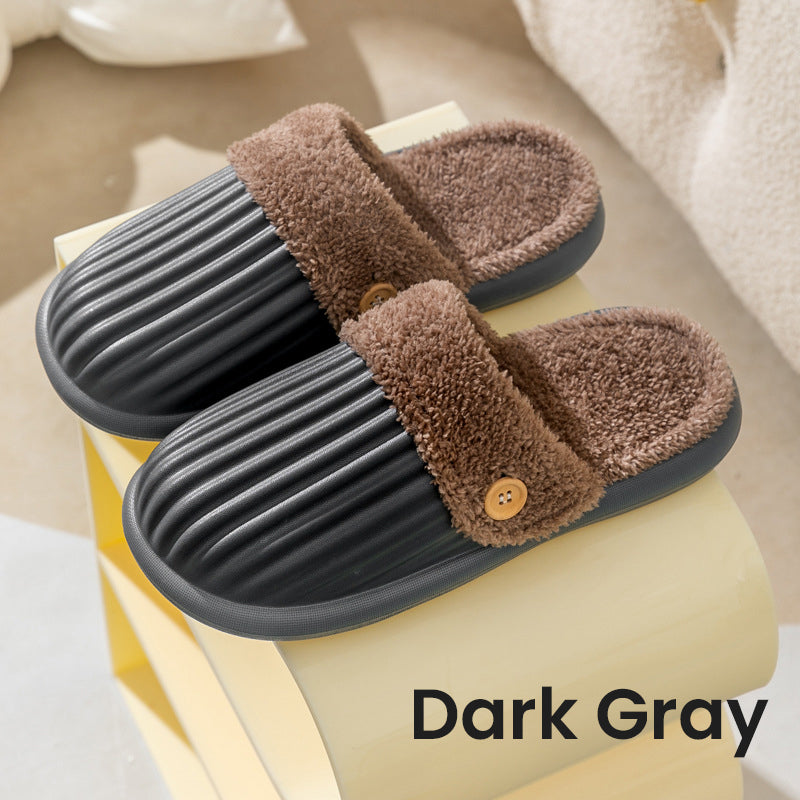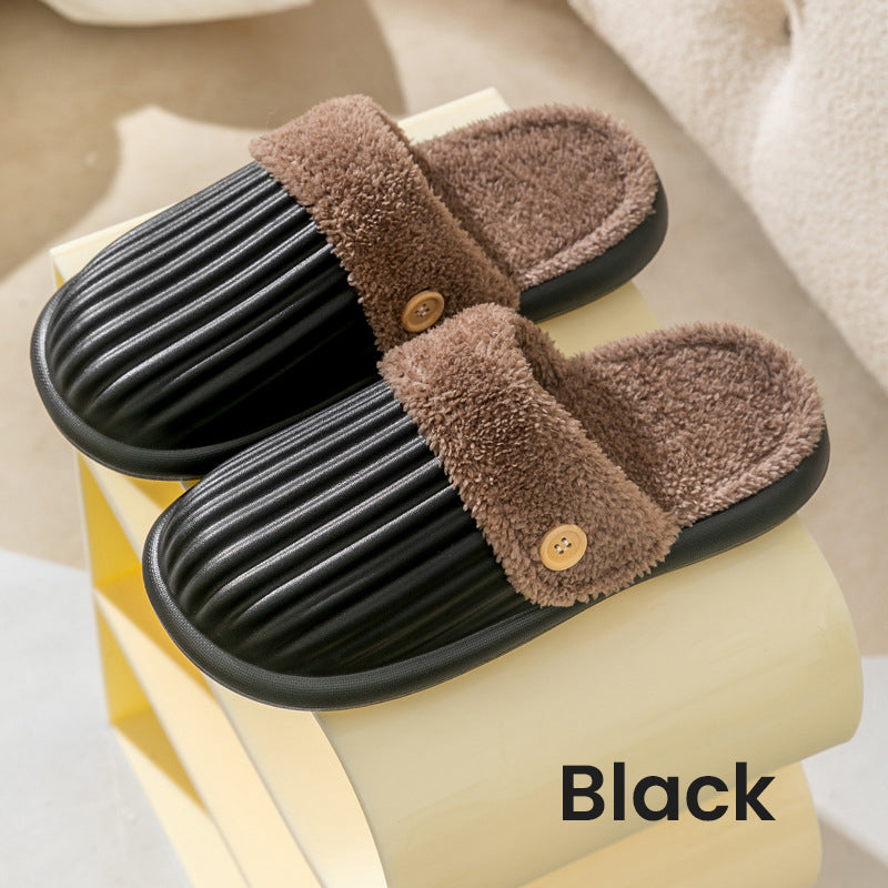 STILVOLL UND DURCHDACHT – Diese Hausschuhe gehen beim Stil keine Kompromisse ein. Mit Streifenmuster und modischen Elementen wie Knöpfen und Wendekante sind sie ebenso modisch wie funktional.