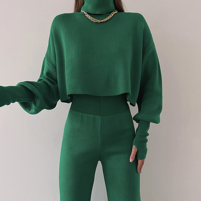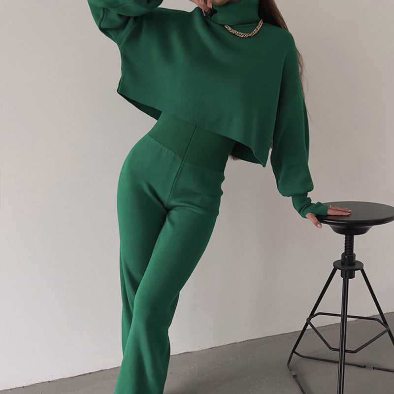 Damen-Outfit mit langärmeligem hochgeschlossenem Crop-Top und Hose