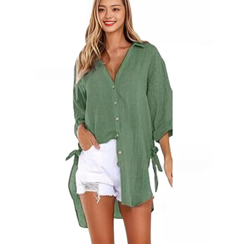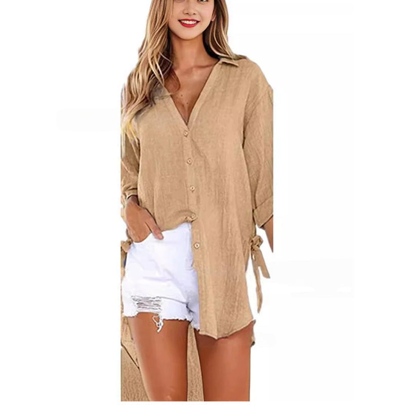 IRREGULAR HEMLINE - Designed with an asymmetrical hem, this shirt adds a contemporary twist to the classic button-up. The uneven hemline creates a dynamic look that is both chic and modern, making it perfect for pairing with jeans, skirts, or leggings.