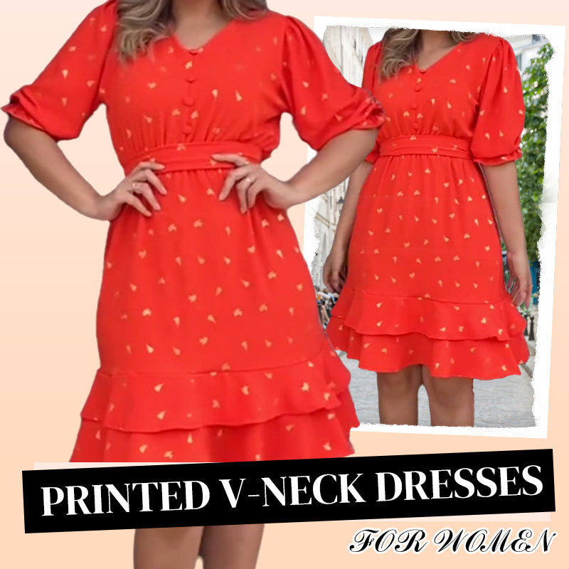 💕Bedruckte Damenkleider mit V-Ausschnitt und kurzen Ärmeln und Knopfleiste