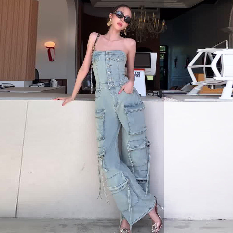 đValentinstag đDamen Retro Denim TrĂ€gerloser Cargo Jumpsuit
