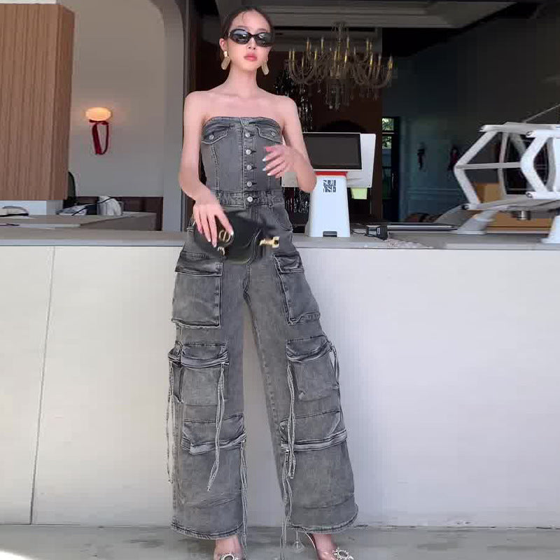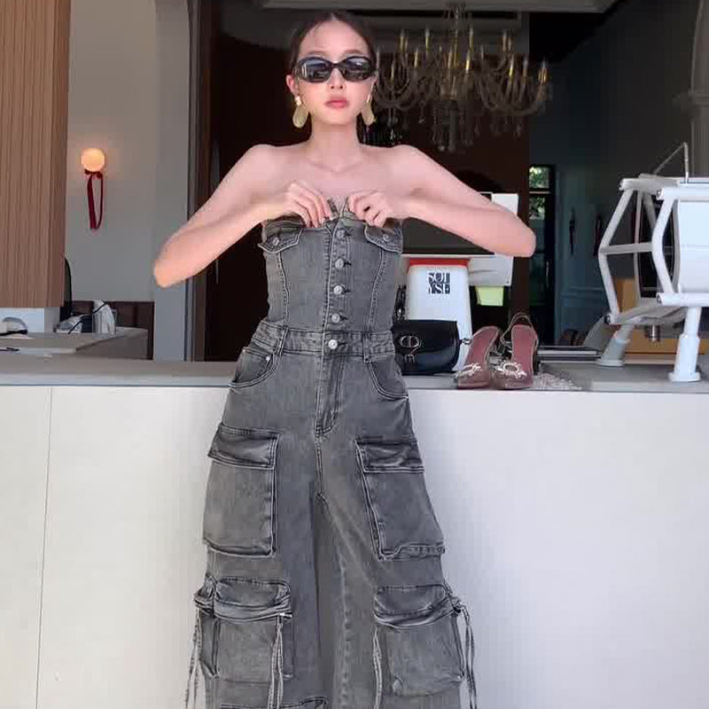 Paket beinhaltet:1*Damen Retro Denim trÀgerlosen Cargo Jumpsuit