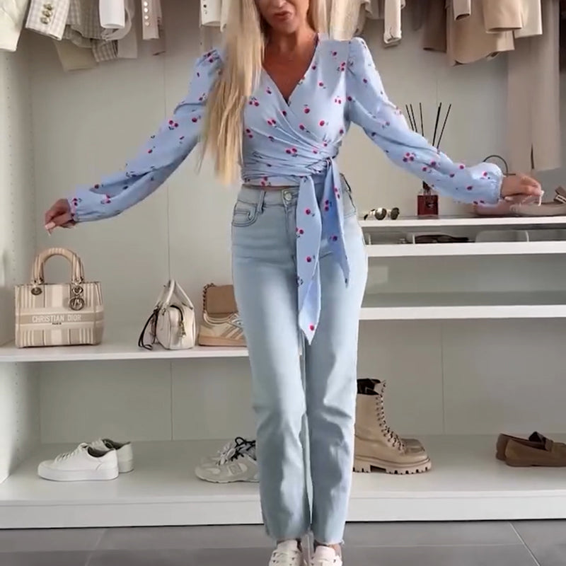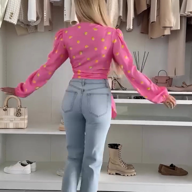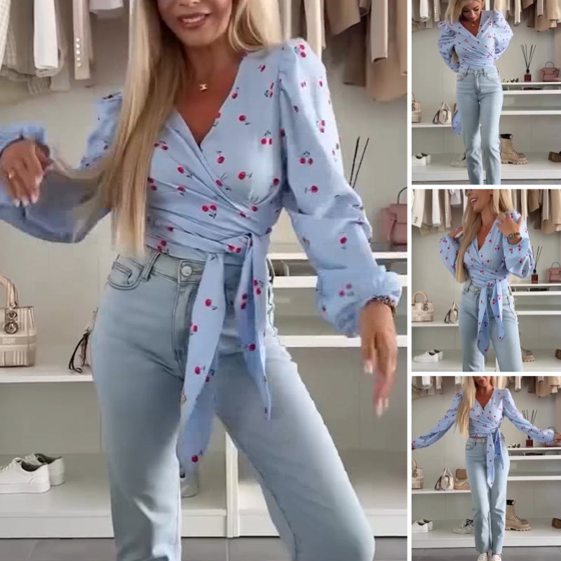💕Was soll ich morgen anziehen?💕Damen-Top mit Bindegürtel und Puffärmeln in lebendigen Farben
